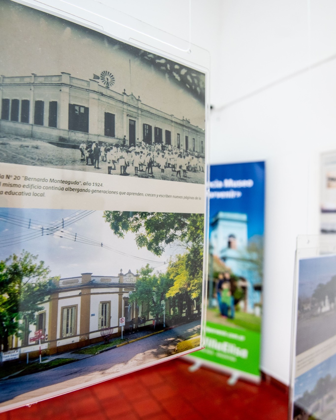 La exposición reúne fotos históricas de distintos espacios de Villa Elisa junto a sus réplicas actuales, generando un diálogo visual entre pasado y presente.
